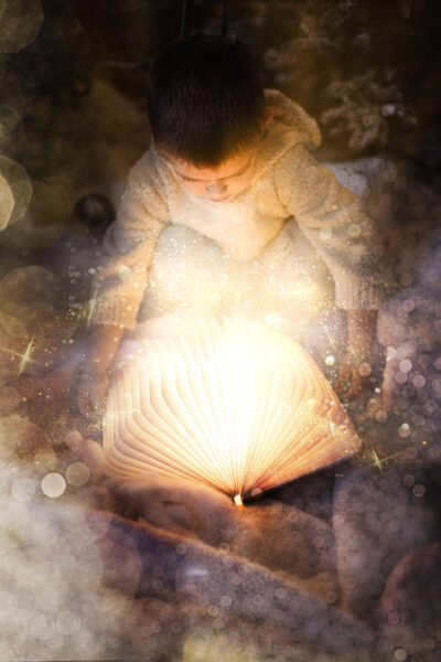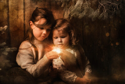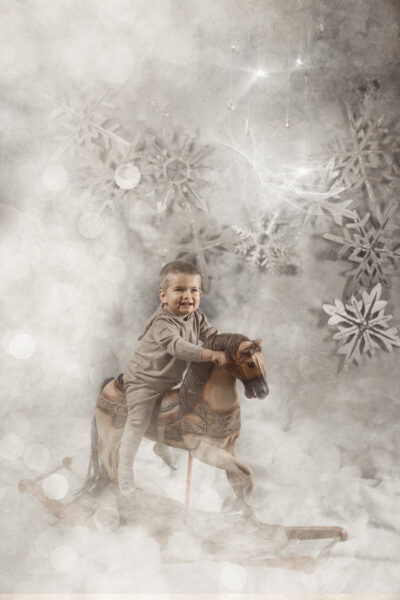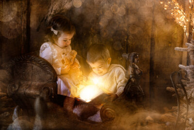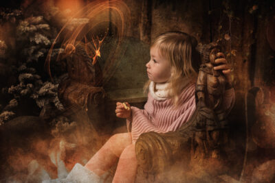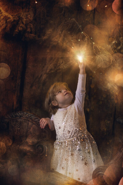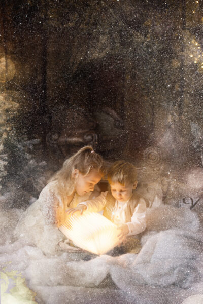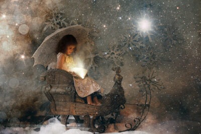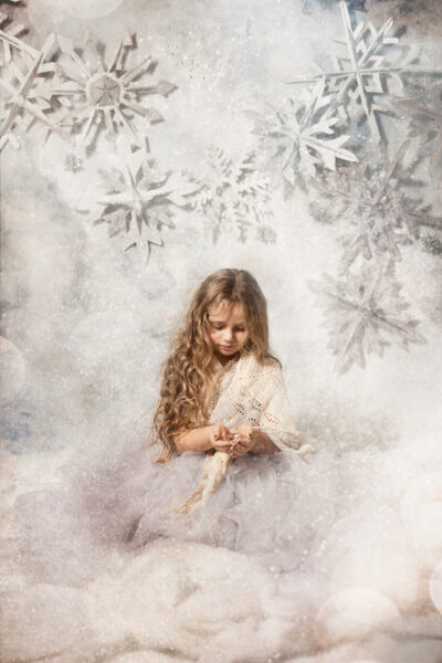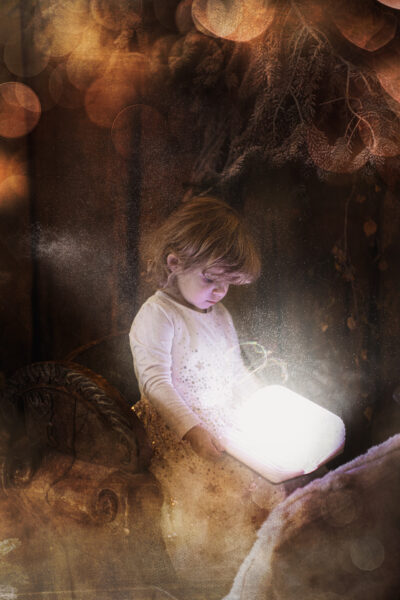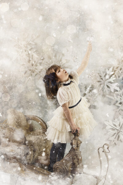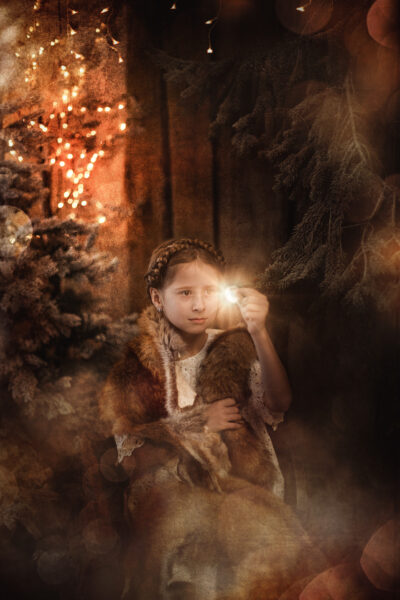 Für einen kurzen Zeitraum entsteht eine neue Welt in meinem Studio. Ein paar Wochen vor Weihnachten baue ich mein Studio in eine manchmal weihnachtliche, manchmal winterliche Fantasiewelt um. Kunstschnee, Kristalle, historische Schlitten, Bäume, Lichter, leuchtende Bücher- all das läßt die Magie aufleben. Aber nicht nur das Set selbst erzeugt diese Stimmung. Meine nachträgliche Bearbeitung mit Licht, Fantasiewesen und Glitzer rundet den Zauber ab.